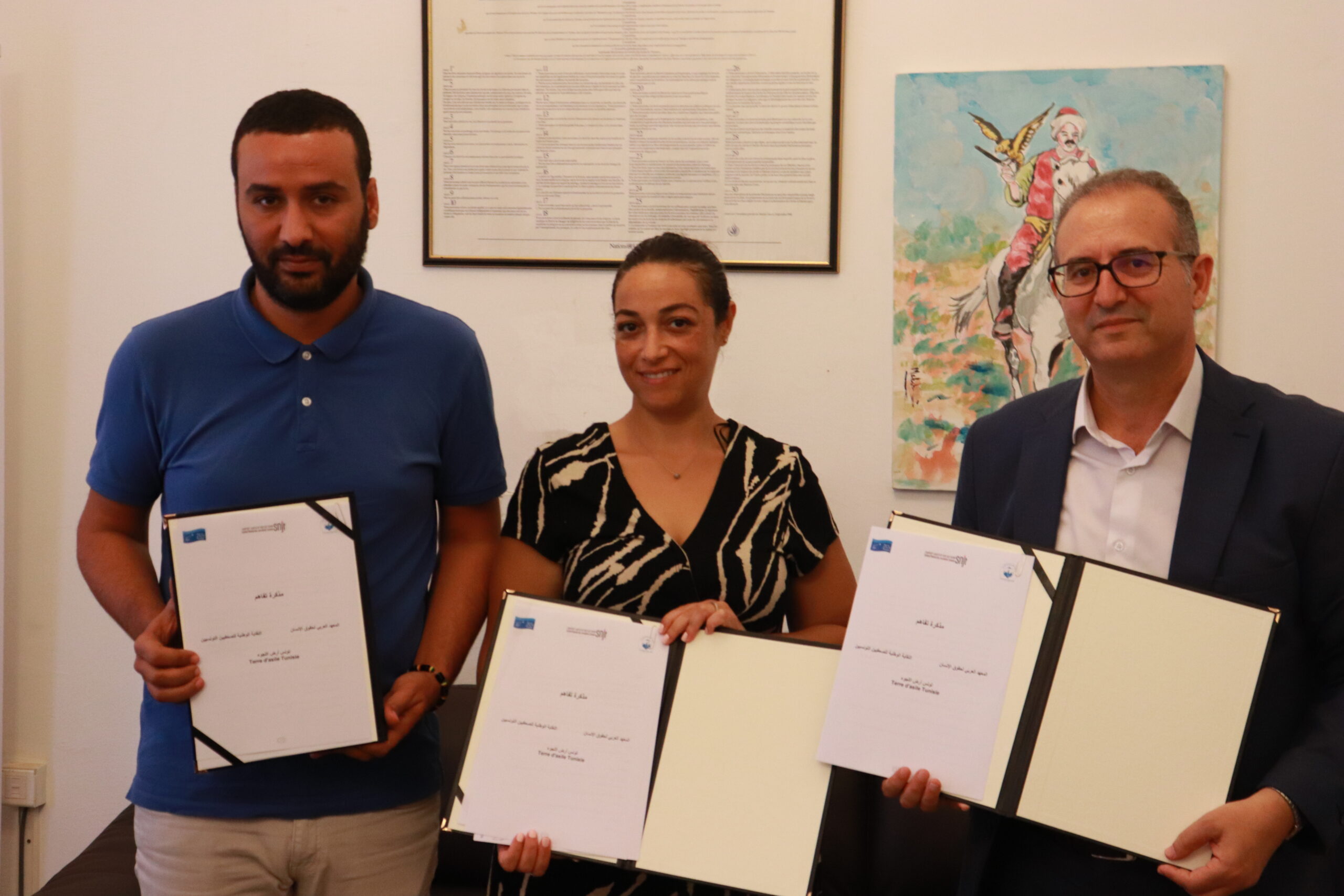 وقع اليوم محمد ياسين الجلاصي رئيس النقابة الوطنية للصحفيين التونسيين و الاستاذ عبد الباسط بن حسن رئيس المعهد العربي لحقوق الإنسان والسيدة شريفة الرياحي المديرة التنفيذية لتونس أرض اللجوء، إتفاقية تعاون ثلاثية لتمتين جسور الشراكة بينهم وتعزيز قدرات الصحفيين والصحفيات في مجال الهجرة واللجوء.