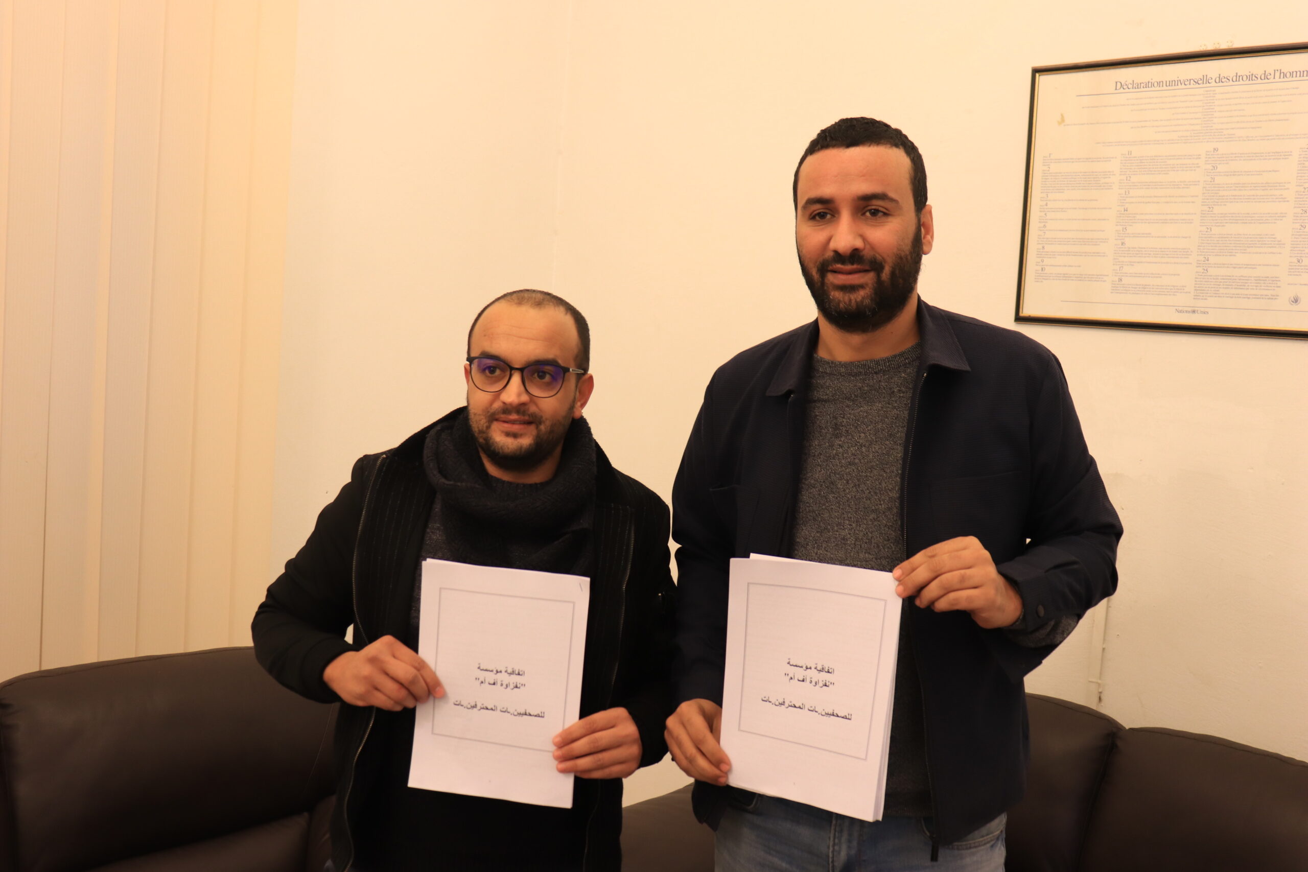 أمضى، اليوم السبت 24 ديسمبر 2022، كل من نقيب الصحفيين التونسيين محمد ياسين الجلاصي و الممثل القانوني لمؤسسة “نفزاوة أف أم ” فهمي البليداوي ، اتفاقية مؤسسة.