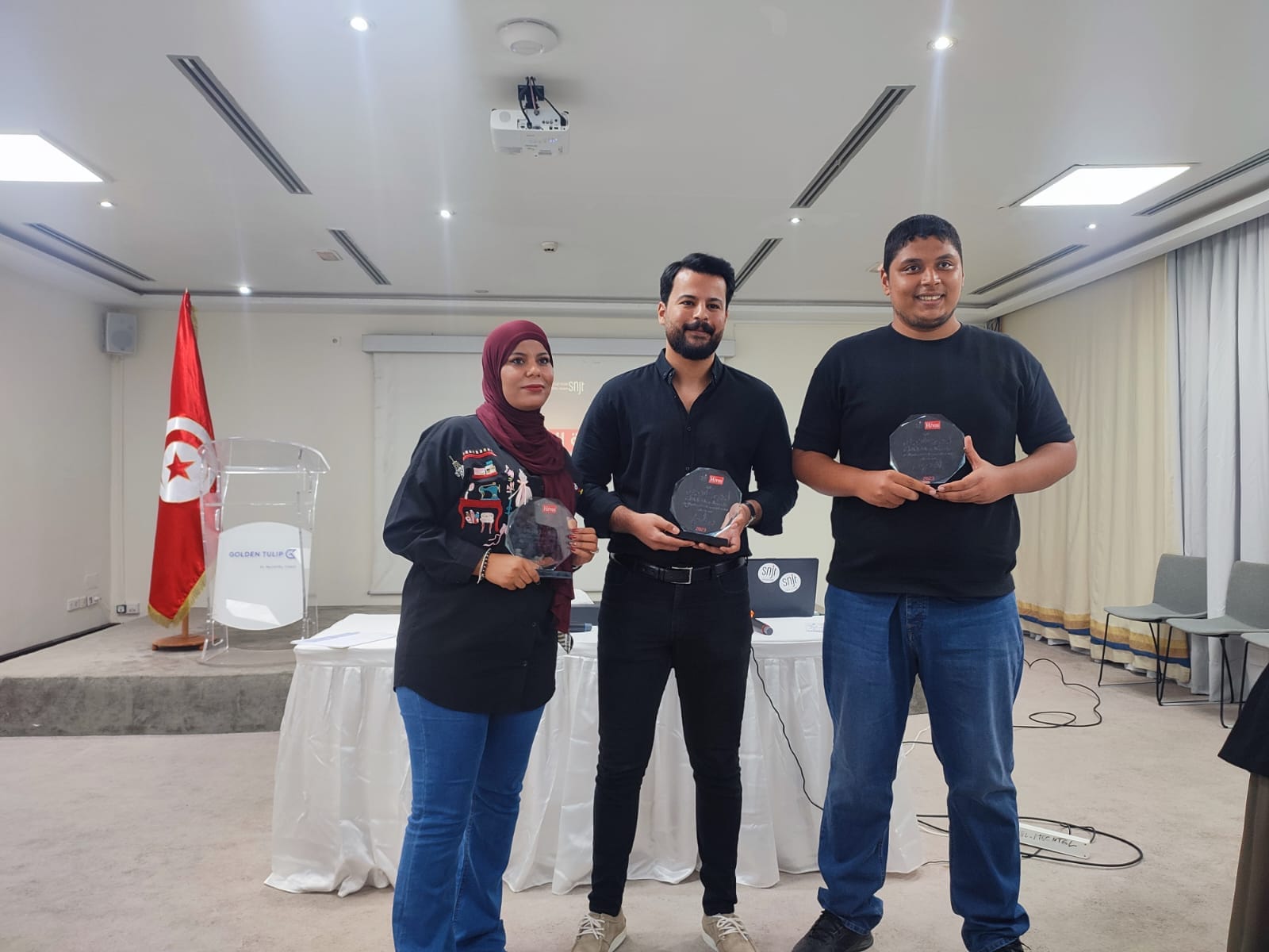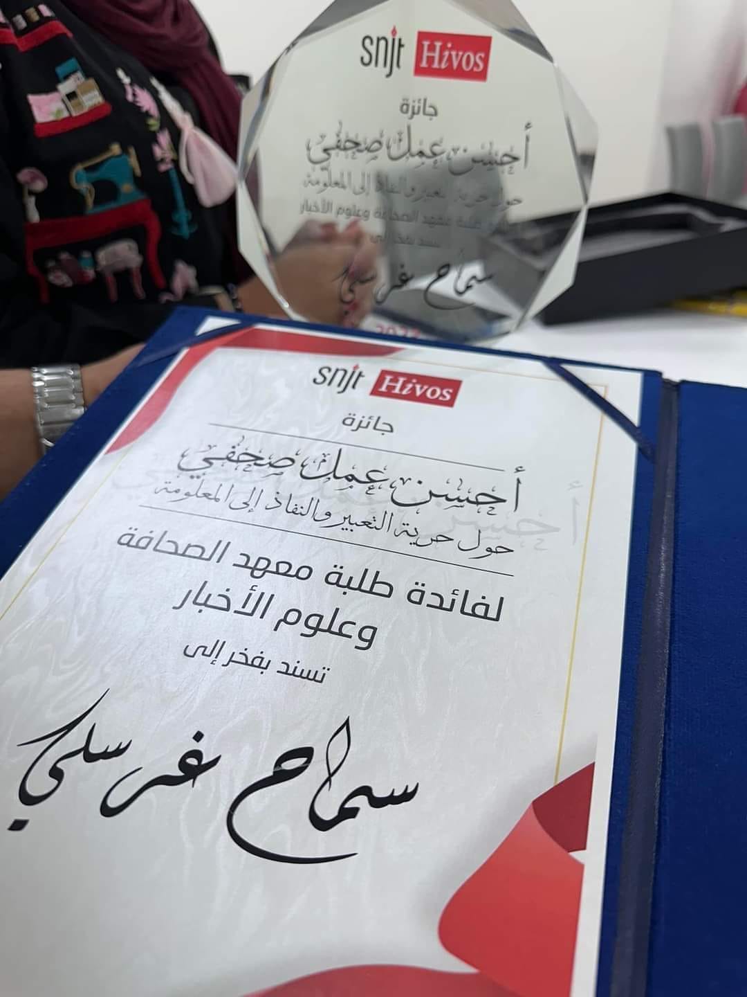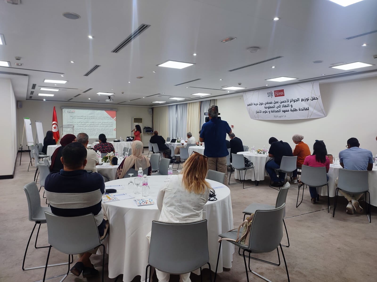 نظمت النقابة الوطنية للصحفيين التونسيين وبدعم من منظمة هيفوس حفل توزيع الجوائز لأحسن الأعمال الصحفية حول حرية التعبير والنفاذ إلى المعلومة الموجهة لطلبة معهد الصحافة وعلوم الأخبار وذلك يوم الجمعة 13 اكتوبر 2023.