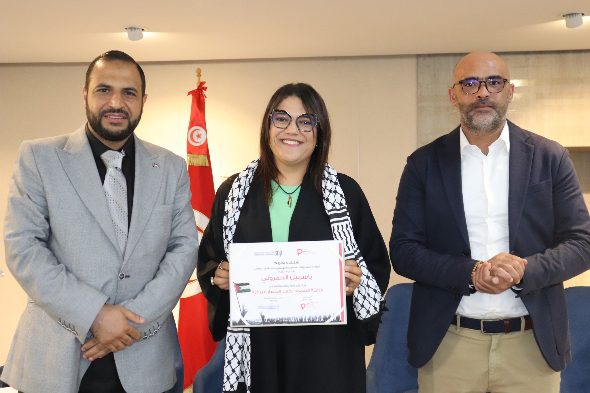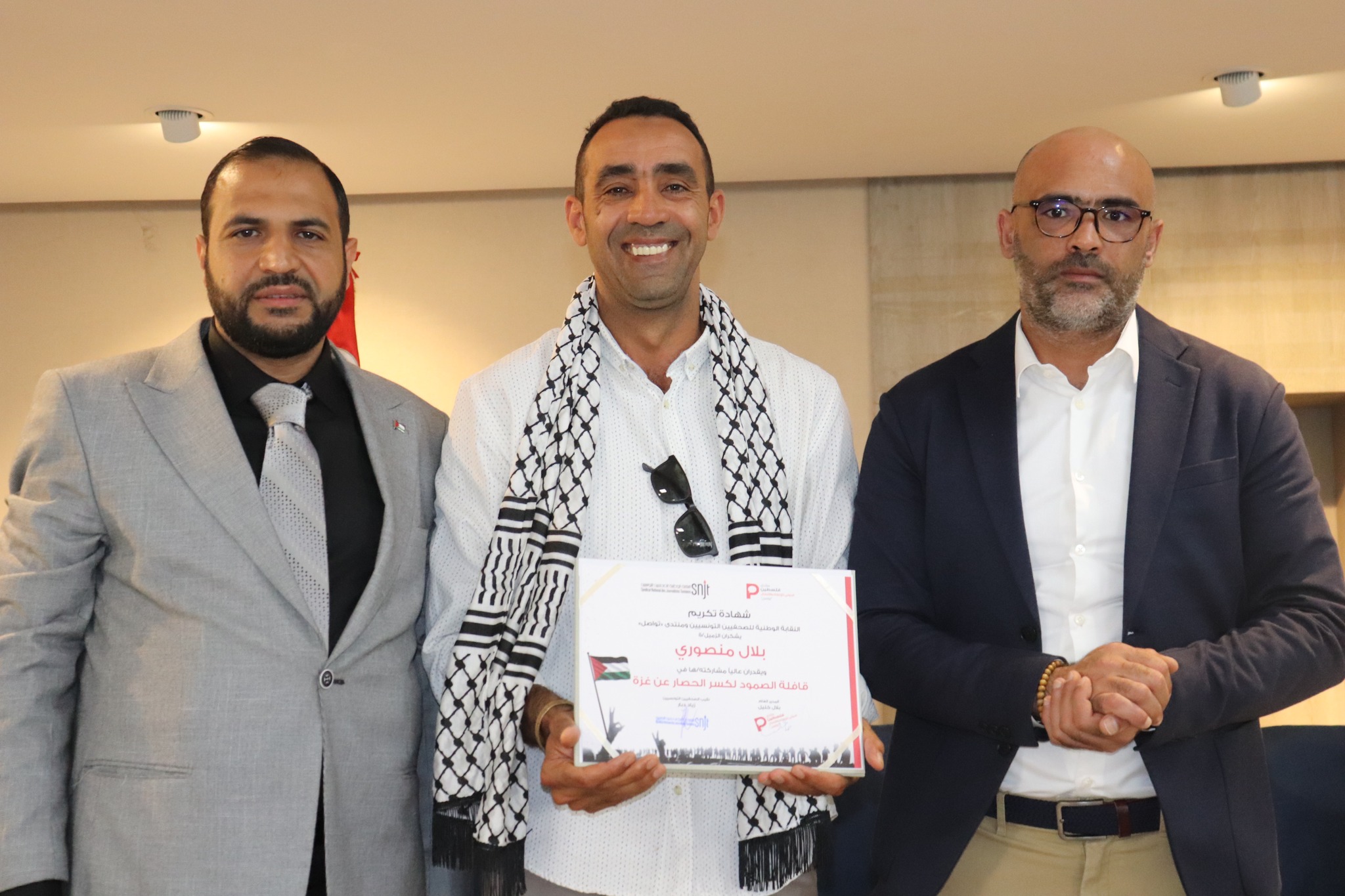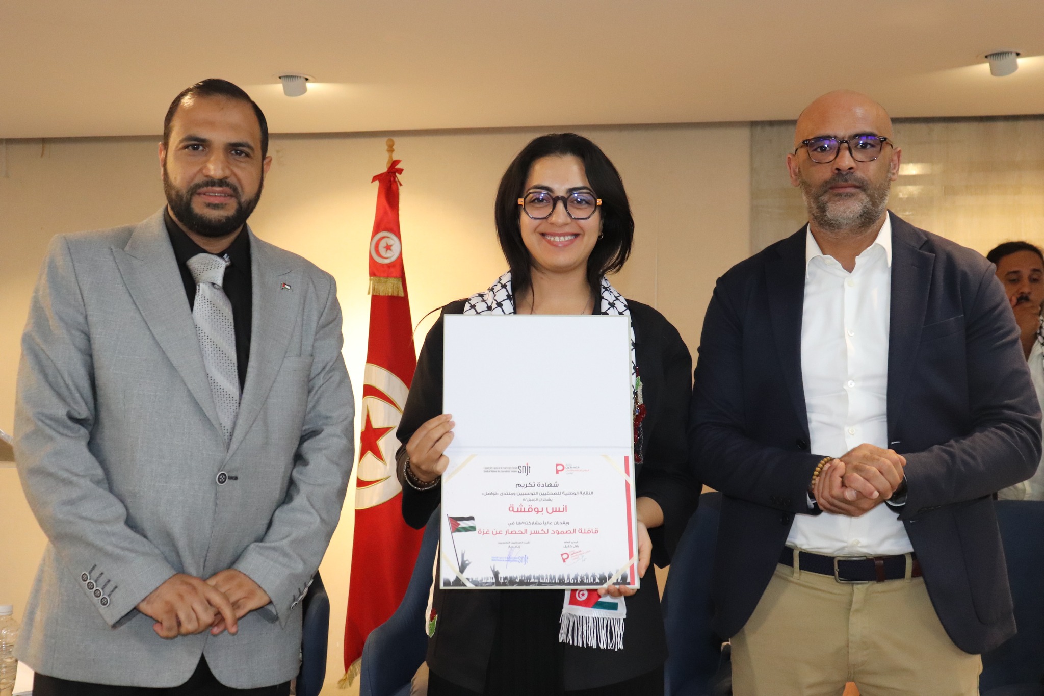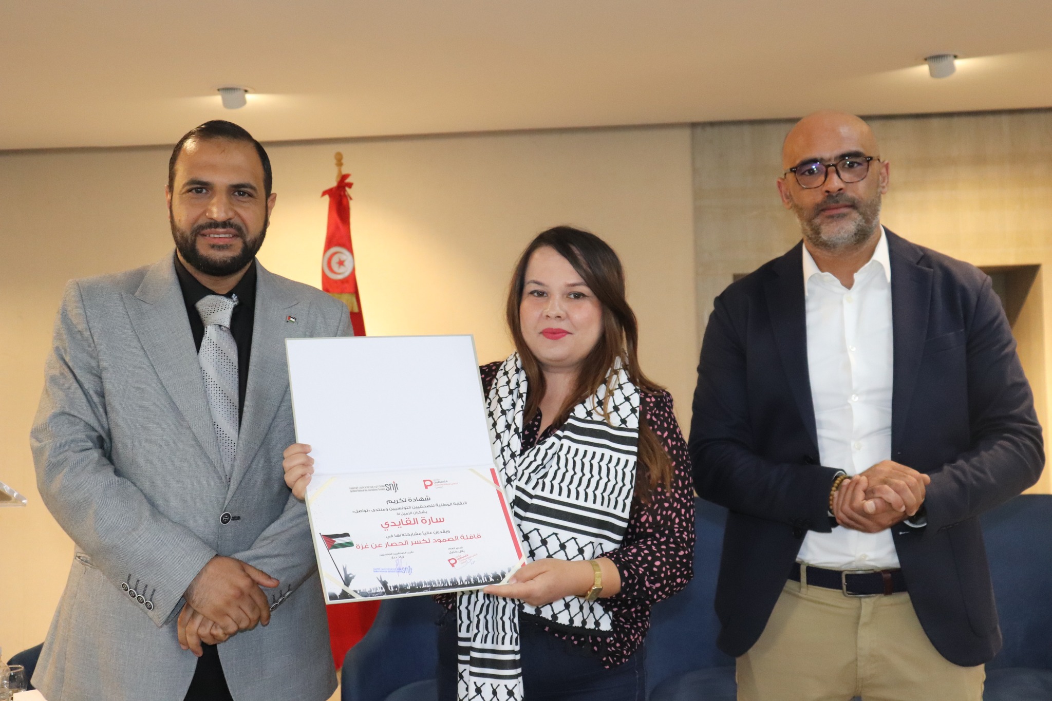 تم في آخر اللقاء تكريم الصحفيين/ات والمصورين الصحفيين/ات التونسيين/ات المشاركين في قافلة الصمود لكسر الحصار عن غزة