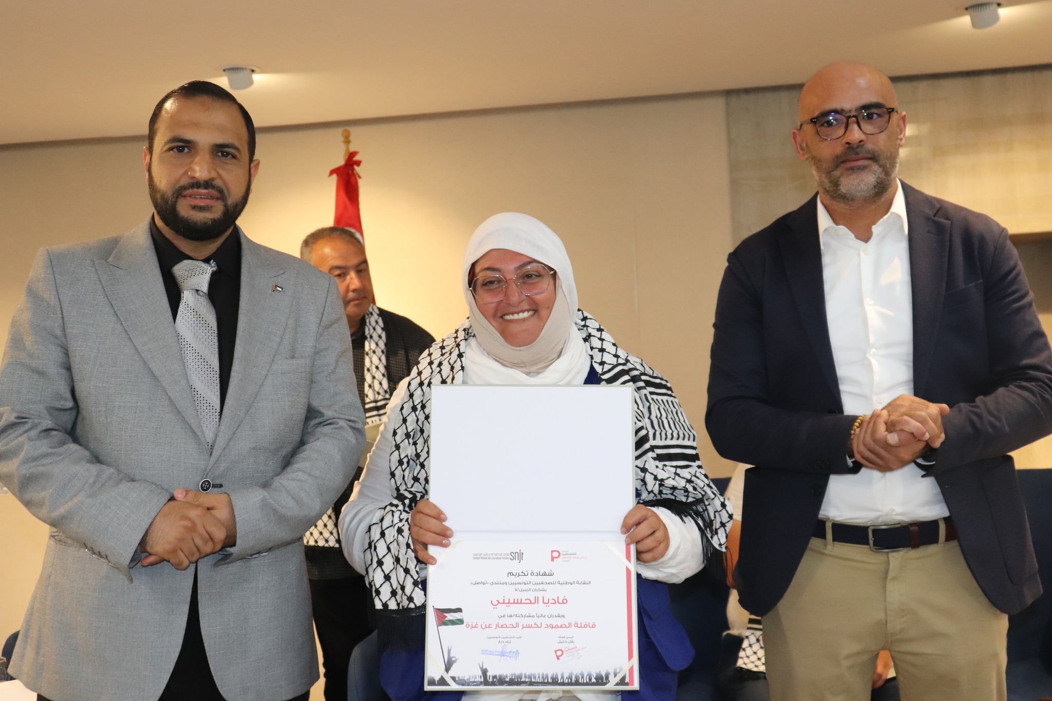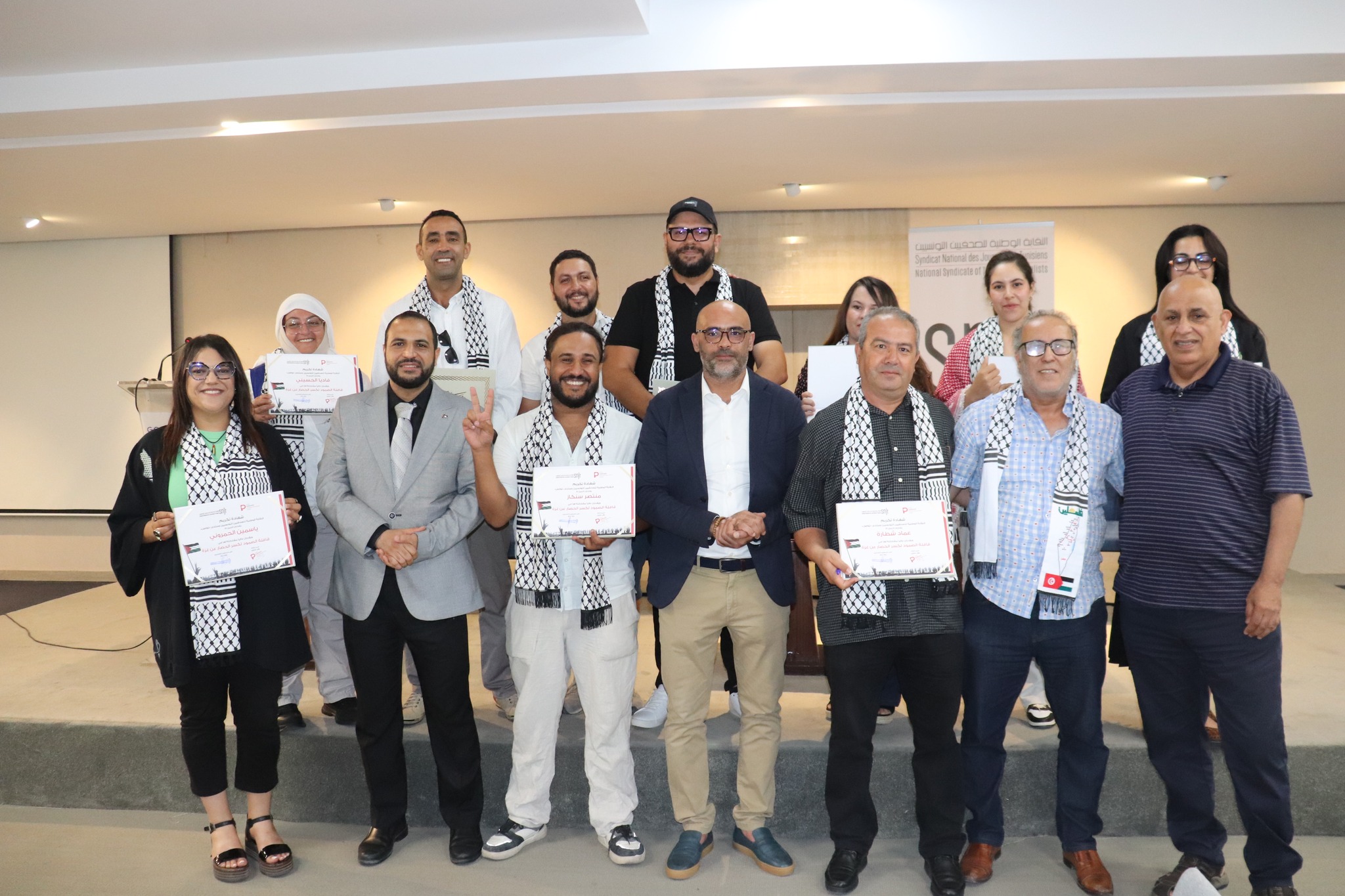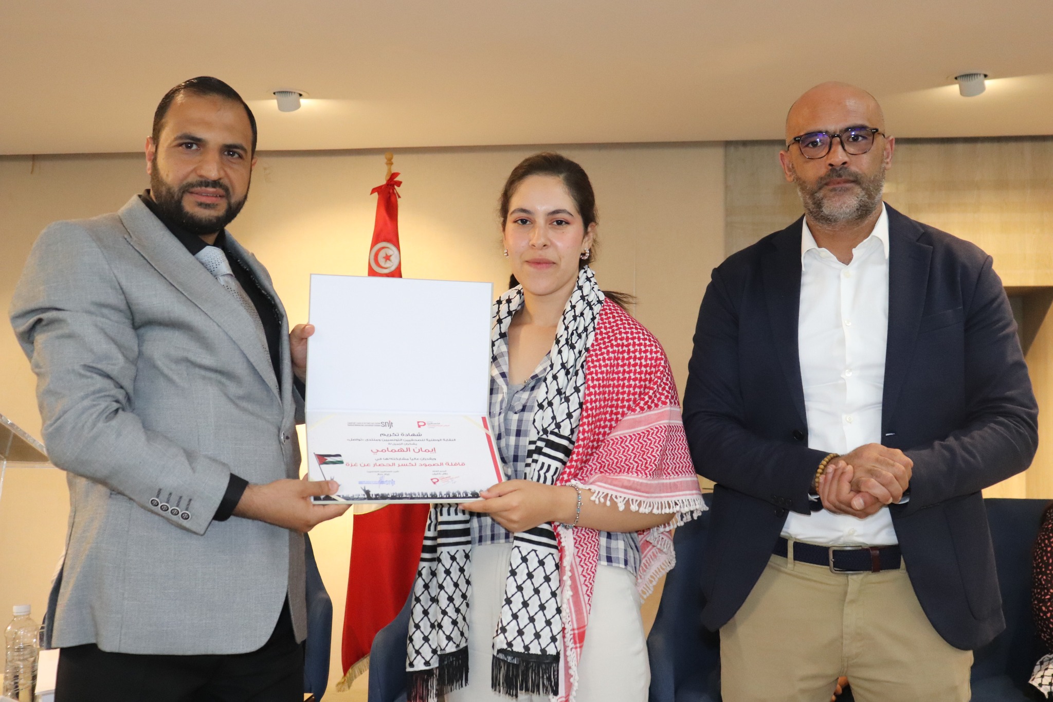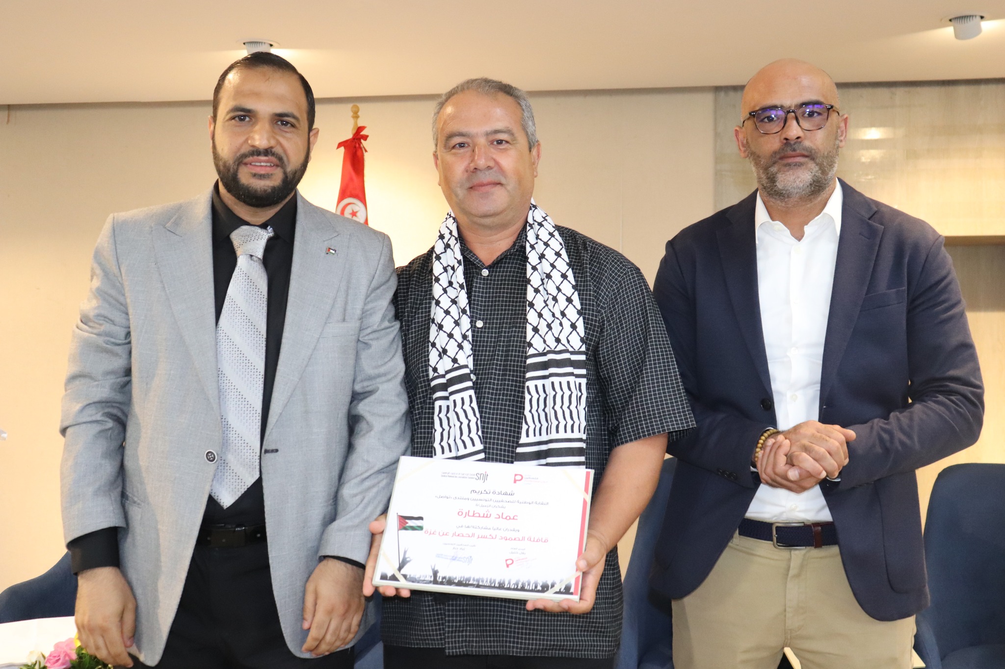 تم في آخر اللقاء تكريم الصحفيين/ات والمصورين الصحفيين/ات التونسيين/ات المشاركين في قافلة الصمود لكسر الحصار عن غزة
