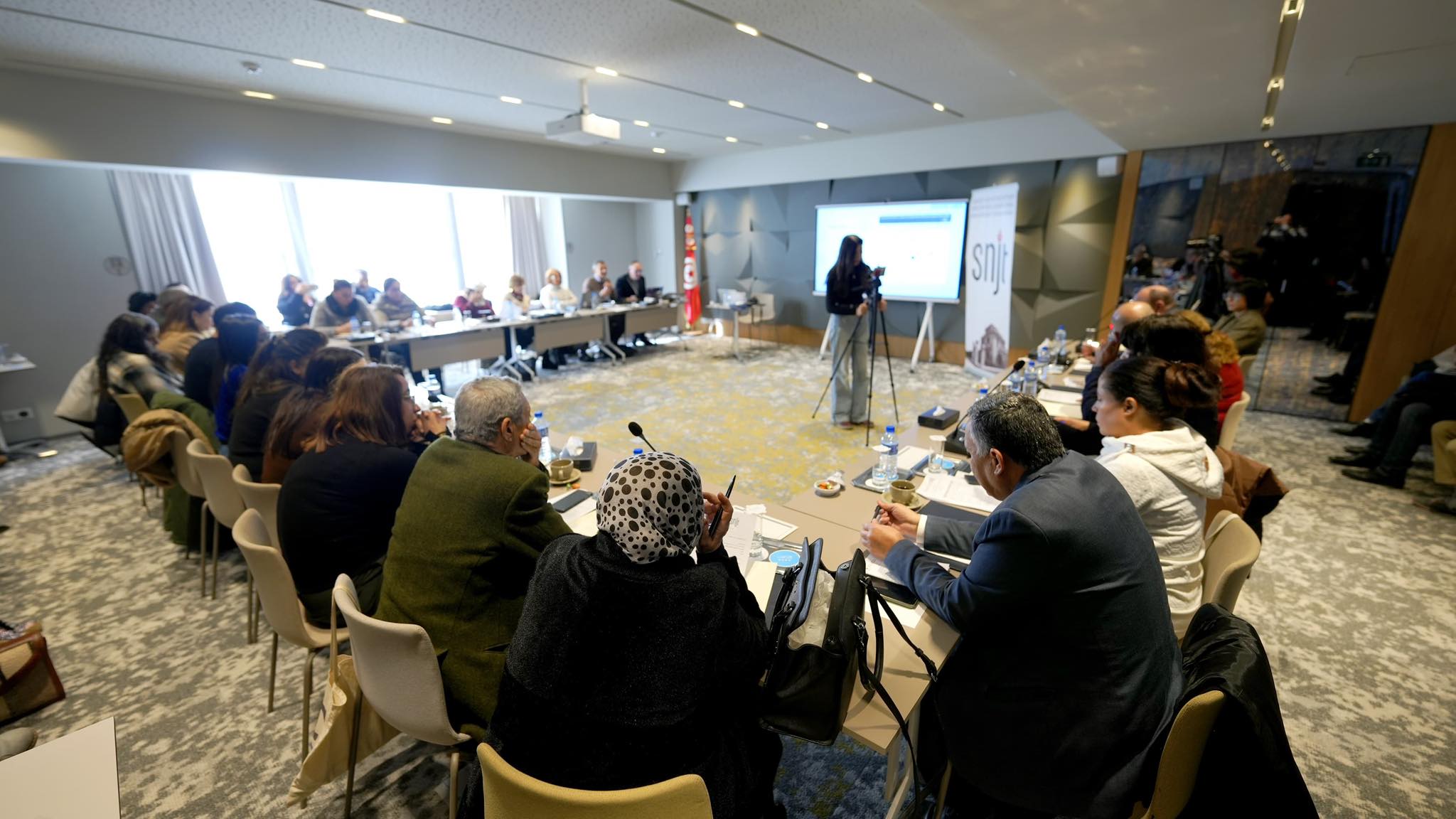 نظّمت النقابة الوطنية للصحفيين التونسيين، اليوم الثلاثاء 30 ديسمبر 2025، لقاءً حواريًا بعنوان «الصحفيون فاعلون في اقتصاد الإعلام»، وذلك بفندق البلفيدير بالعاصمة تونس، بمشاركة عدد من الصحفيين/ات، الأكاديميين، والخبراء في مجالات الإعلام، الجباية، الاستثمار وريادة الأعمال.